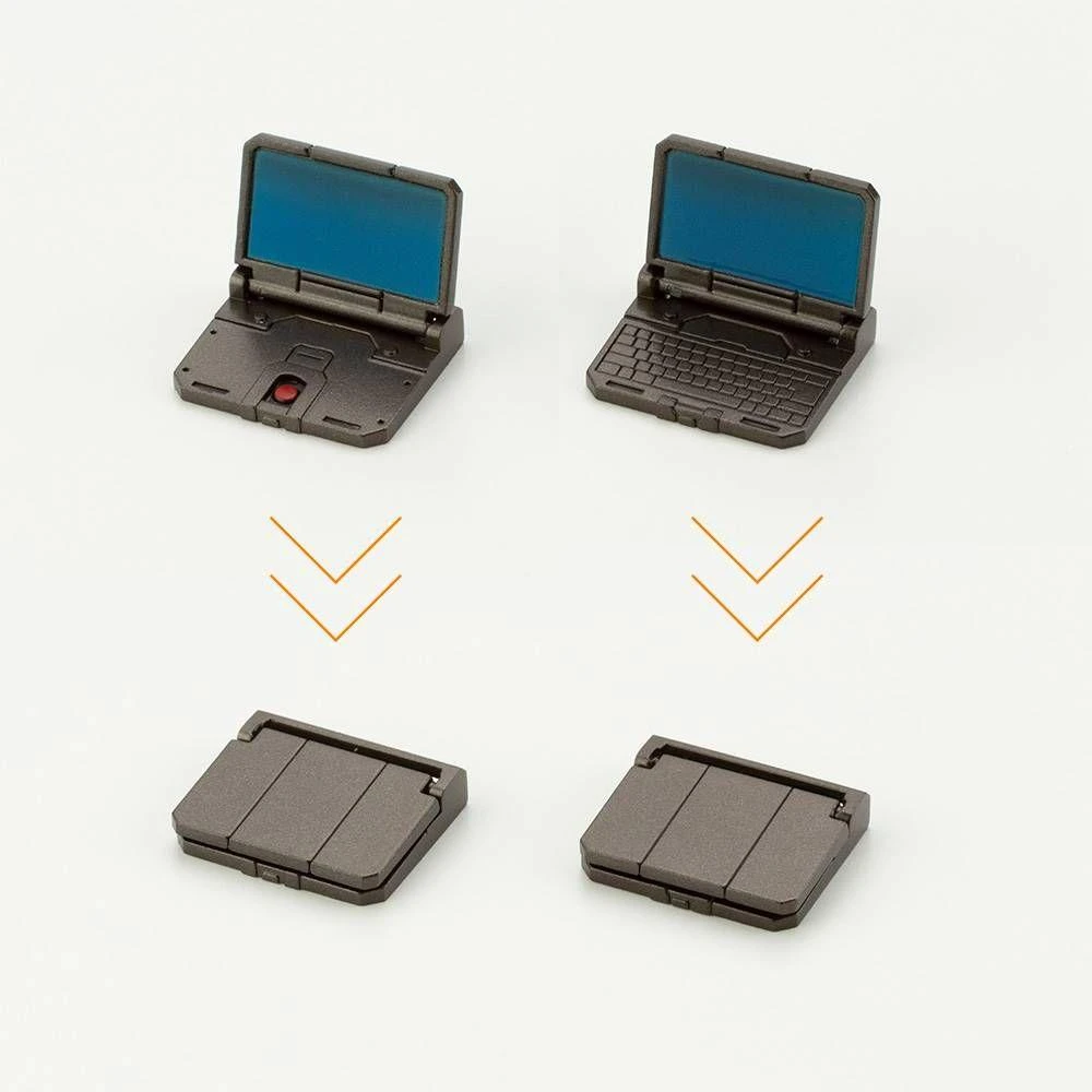 This DX set includes various small accessories such as a large monitor, chair, control panel, etc. to further emulate a base of operations. A sentry gun is also included in this set. The monitors of the laptop terminals are able to be opened and closed which demonstrates the high level of craftsmanship that went into these accessories despite its small size. The large monitor was designed to allow printed inserts so users can insert images of their choosing cut into the designated size to further emulate a mission briefing within this base. The mounted sentry gun is made with 3mm joints for flexible movement and depending on the HEXA G-R.A.M, can be mounted on other Hexa Gear models.