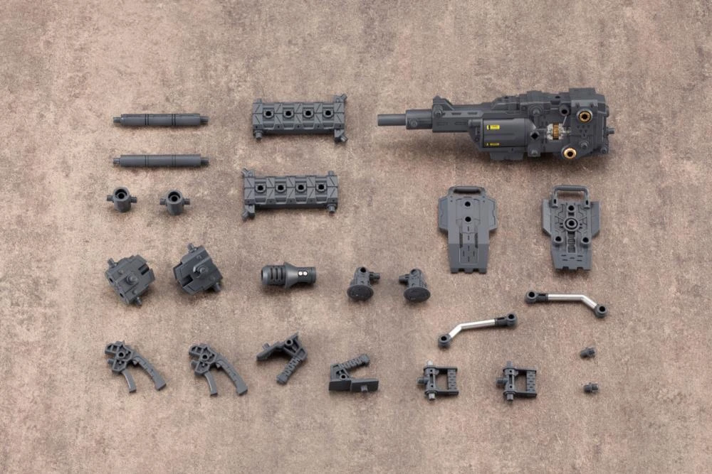 By installing an EXTERNAL GENERATOR, users can enjoy the barrel recoiling like gunfire and the cylinder on the revolver spin for reload. Since the various accessories, including armor plates, grips with multiple designs, and radomes, have standard 3mm connection joints, they can be attached to Frame Arms and Frame Arms Girl models. Additionally, the unit itself can be reassembled to form various weapons such as a double-barrel shotgun, shield, and grenade gun. The features of the barrel and cylinder can still be enjoyed manually without an EXTERNAL GENERATOR.