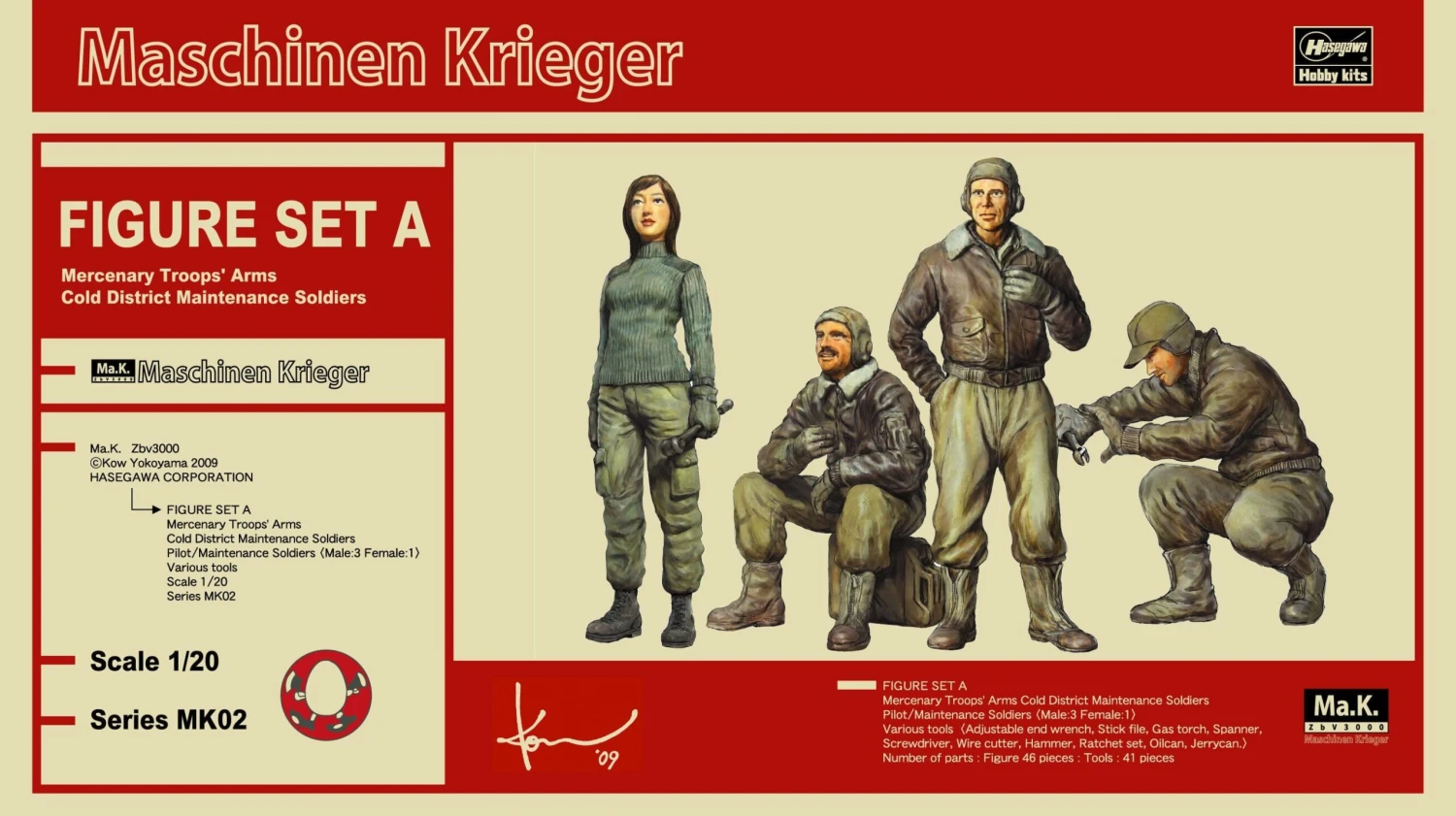 A set of fantastic Ma.K. Mercenary Troops’ Arms and Cold District Maintenance Soldiers figures from Hasegawa! The perfect accompaniment for Hasegawa’s 1/20 Falke kit (sold separately). Figure Set A includes three male and one female pilot/maintenance soldiers, plus various tools.