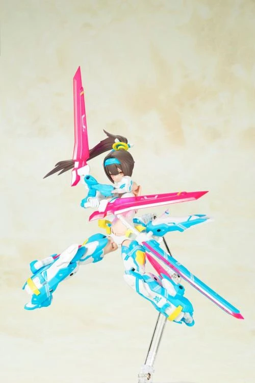 She has 3 prepainted faceplates, 5 sets of hands, and she comes with her bow and sword (with a clear pink blade). In addition, she can also use weapons and armor from Kotobukiya’s M.S.G., Frame Arms and Frame Arms Girls series! A set of decals is also provided, with eyes and markings.